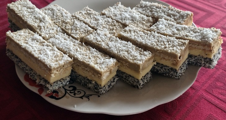 Állandó kevergetés mellett kihűtjük. A vajat kikavarjuk, majd a kihűlt krémet hozzáadjuk, és jól összedolgozzuk. Összeállítás: A krém 3/4 részét a tésztára kenjük. Szögletes háztartási keksszel kirakjuk. A krém 1/4 részét jól összekavarjuk 1 kanál instant kávéporral. Rákenjük a kekszre. Tetejét kókuszreszelékkel szórjuk. Pár órára hűvös helyre tesszük.